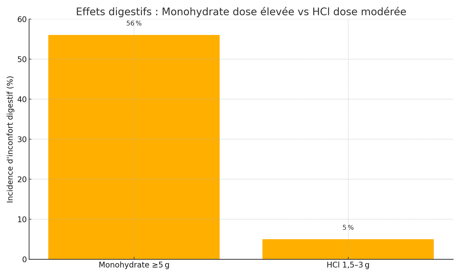Avec 1,5 à 3 g de créatine HCl, les désagréments sont rares grâce à sa solubilité élevée et à son dosage réduit.