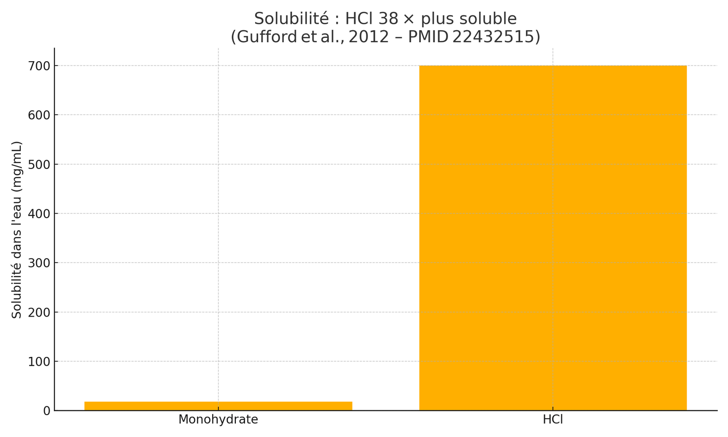 Dans l’eau, la créatine HCl se dissout à ≈ 700 mg/mL, contre ≈ 18 mg/mL pour la monohydrate — soit 38 fois plus.