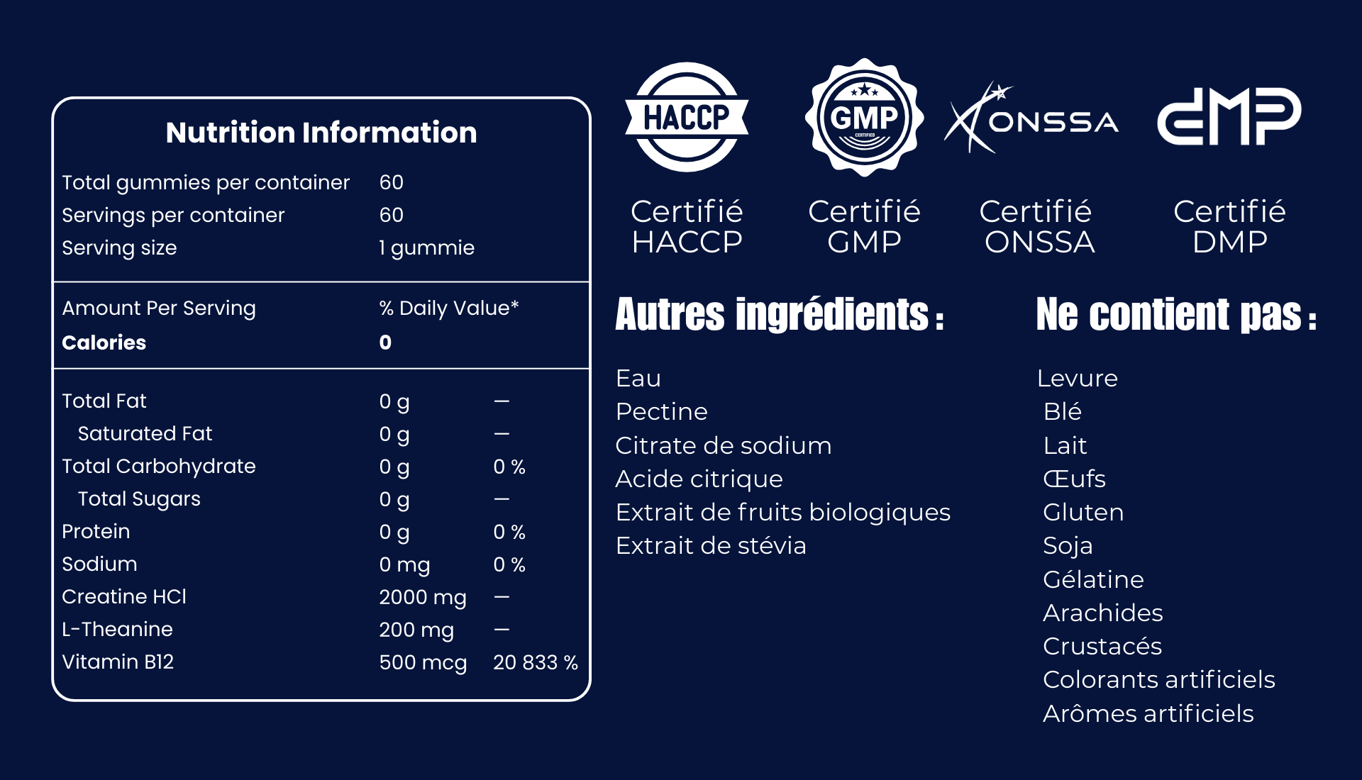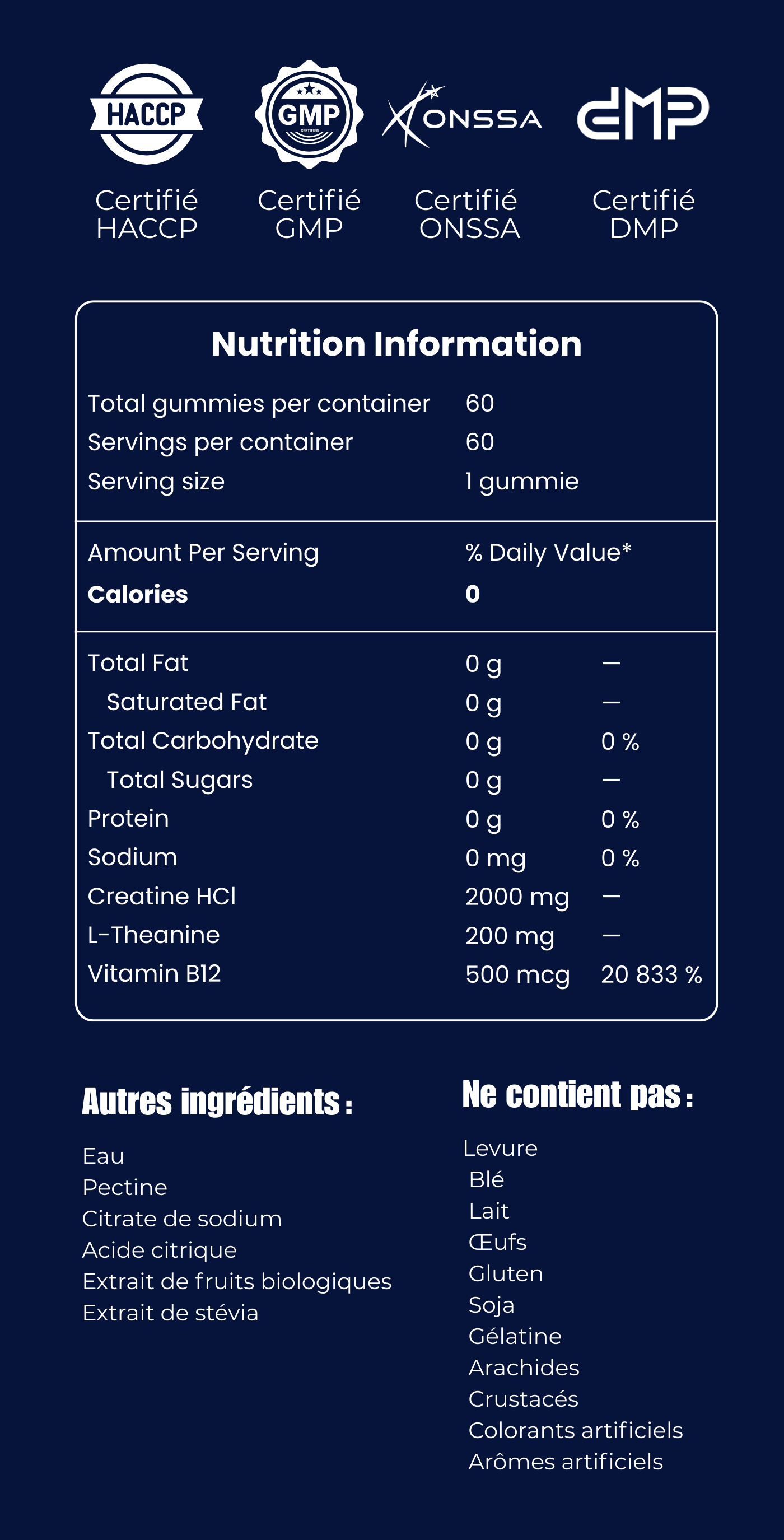 Prenez 2 gummies chaque jour, idéalement après l’entraînement ou avec un repas protéiné. Les jours de repos, gardez la même dose pour maintenir vos réserves. Hydratez‑vous bien (≈ 2–3 L d’eau).